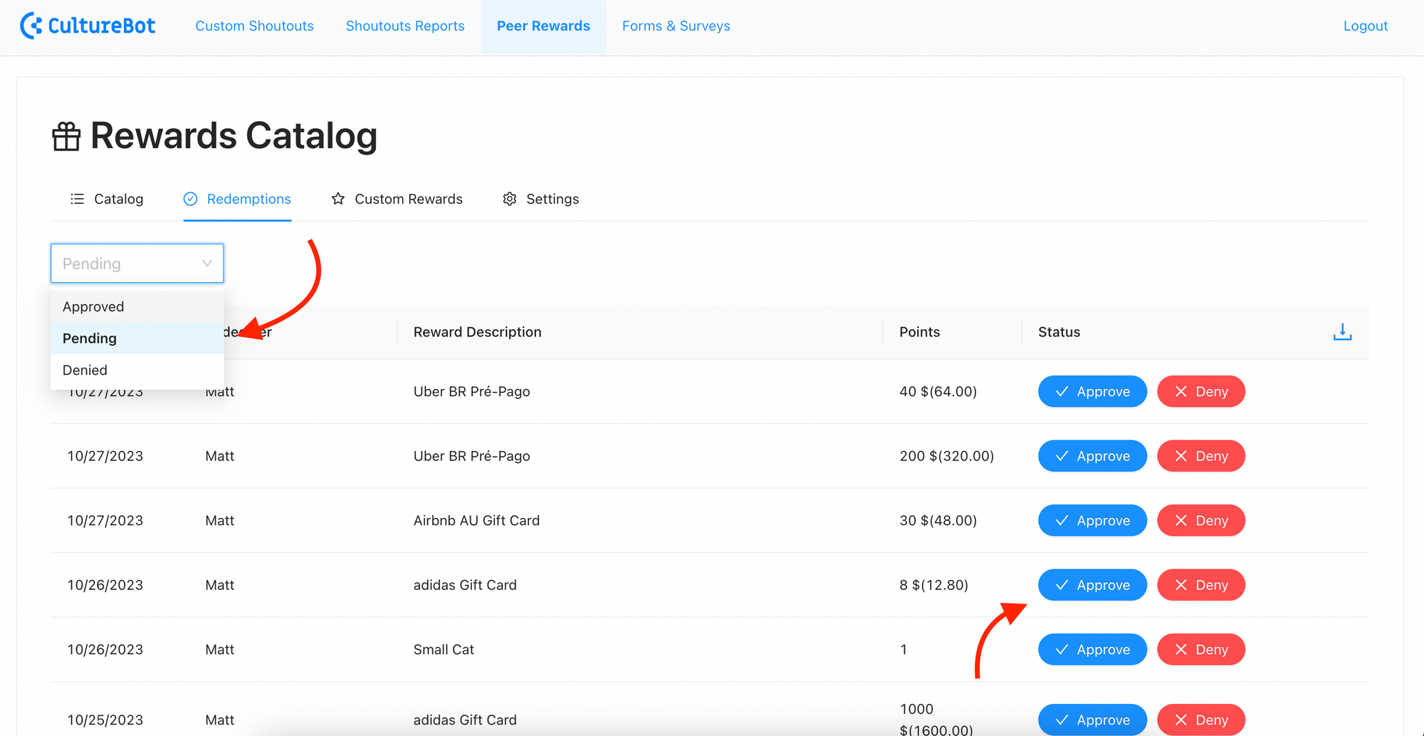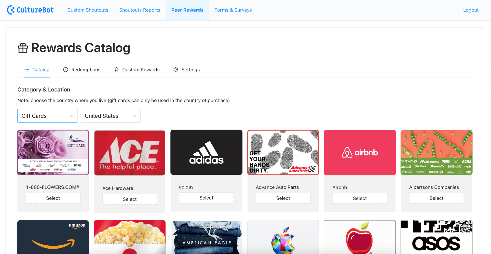 You can access the setup/configuration for gift card automation (by default it will be off for your account) by visiting the 'shoutout/peer rewards' section of the CultureBot admin UI and then clicking on the 'view/add rewards' button.