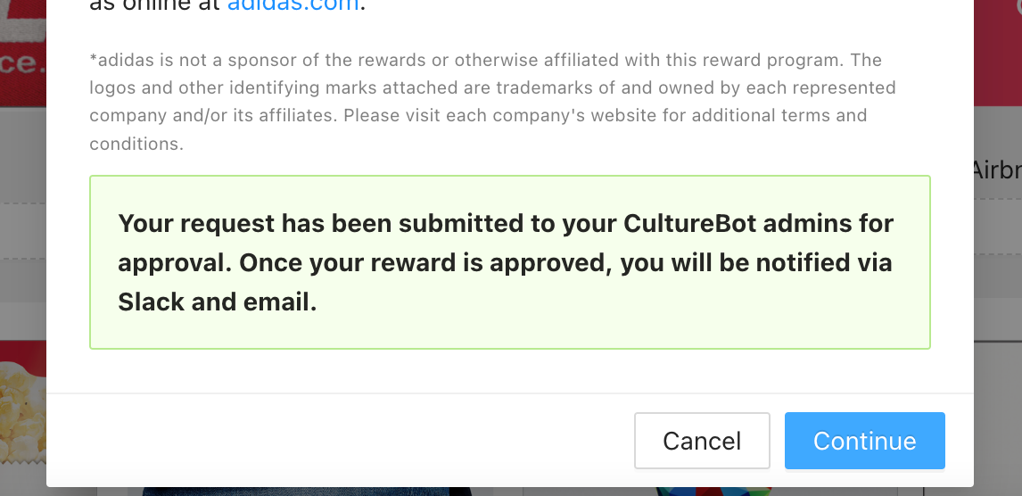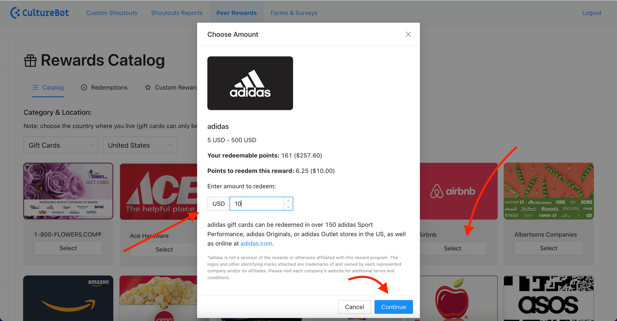 When the gift card catalog is finally enabled, you will see the full catalog (screen above). There are hundreds of gift cards to choose from - and you will want to make sure the correct country is selected before proceeding. Once viewing the proper catalog, click 'select' next to a gift card, and a modal will appear with the brand details. Some gift cards have preset amounts, and others have a range (where you can type in exactly how much you'd like the gift card to be for inside of that range). Once you've determined your amount, click 'continue' – the gift card will then be submitted to admin(s) for approval.