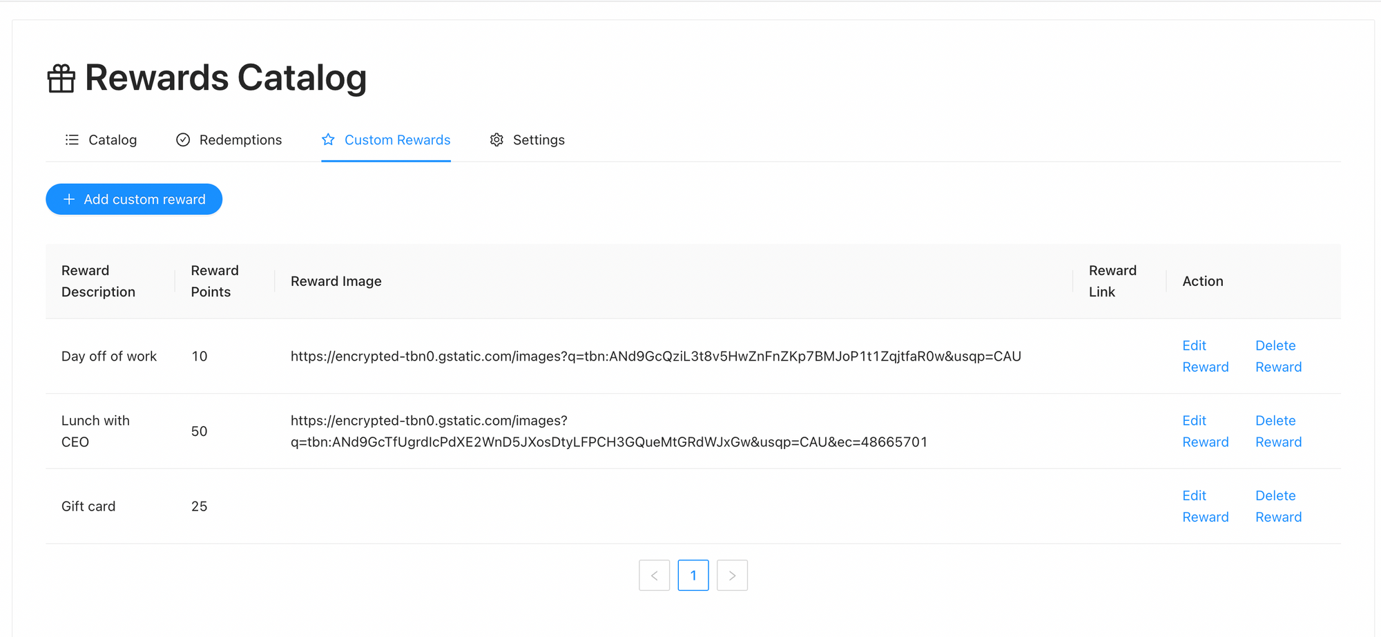 This will show you the rewards catalog - of which it will include just your custom rewards (if you have any). Employee will also be able to visit the gift card catalog (if enabled) by clicking on the 'redeem rewards for gifts' link at the bottom of shoutouts (that are sent with points).