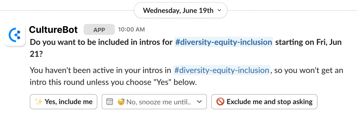 Employee who have not responded/engaged in 3 or more intro pairings will now be notified via CultureBot asking them if they'd: