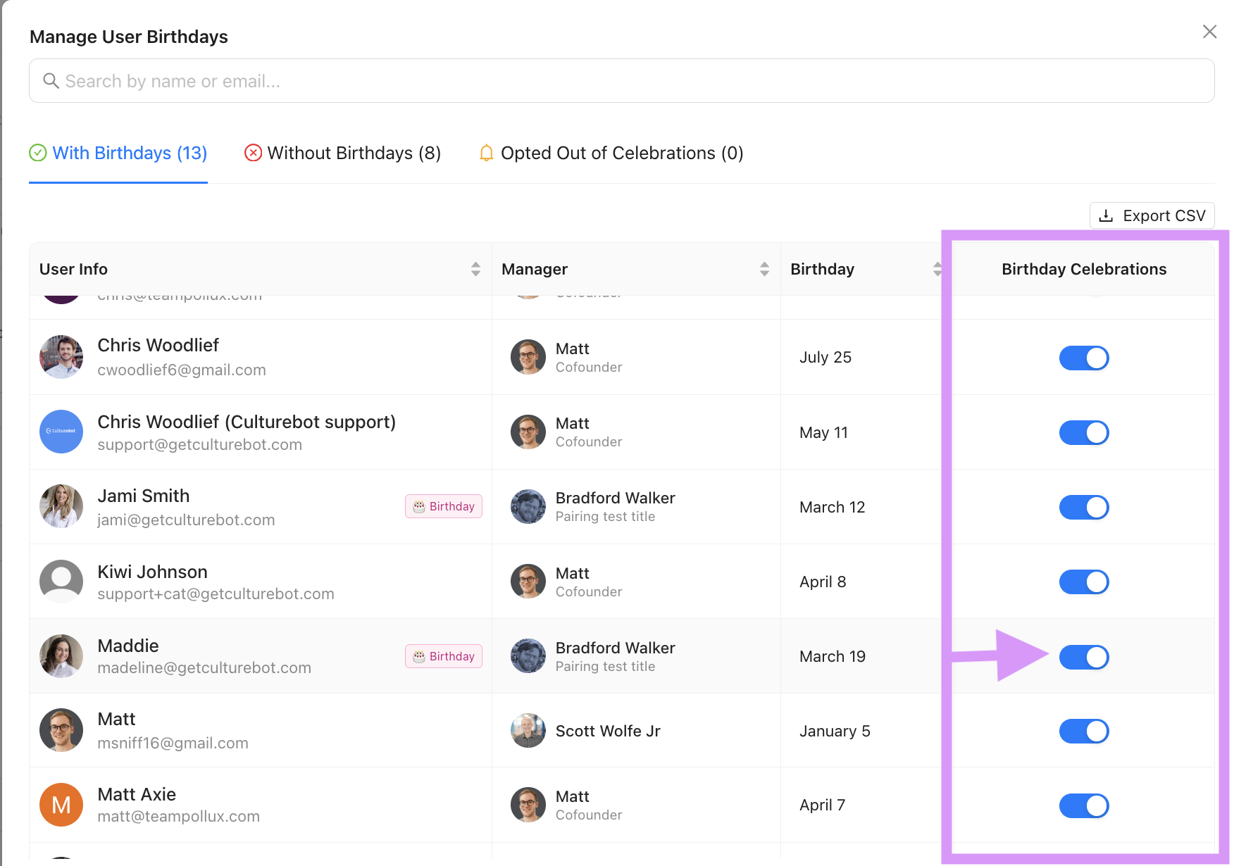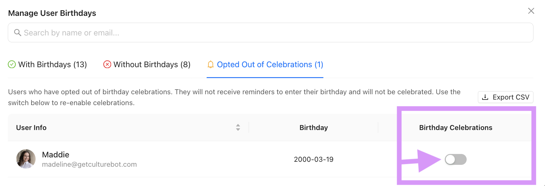 Here, you can select to opt an employee out from birthday or anniversary celebrations by clicking the blue dial under "Birthday Celebrations" or "Anniversary Celebrations" which will move them to the opt-out list.