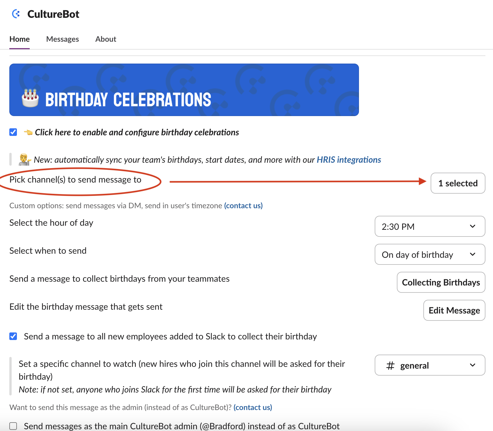 - Go to Birthday Celebrations settings and look for the area: "Pick channel(s) to send message to"